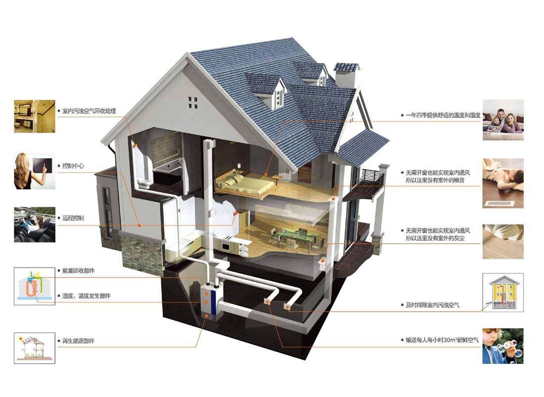 全屋新風(fēng)系統(tǒng)能夠獨(dú)立的進(jìn)行室內(nèi)空氣置換、凈化、流動系統(tǒng),在排除室內(nèi)的污染空氣的同時,輸入100%自然新鮮空氣,并將輸入室內(nèi)的新風(fēng)經(jīng)過中效過濾、殺菌、增氧、滅毒、預(yù)熱(室外空氣較冷時)等多項(xiàng)處理后再送入室內(nèi)。家庭全屋新風(fēng)系統(tǒng)的創(chuàng)新點(diǎn)是:用多臺新風(fēng)機(jī)按空氣流動原理,組成“全屋新風(fēng)系統(tǒng)“形成室內(nèi)新風(fēng)流動場。系統(tǒng)營造的是一種時刻保持室內(nèi)空氣潔凈、清新的、呼吸無憂無慮的健康室內(nèi)環(huán)境。